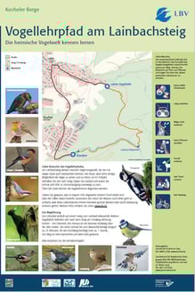 Der beliebte Wanderweg führt im naturbelassenen Lainbachtal hinauf zum Lainbach-Wasserfall. 14 Vogelarten werden am Pfad vorgestellt. Neue Ideen wurden entwickelt. So können z.B. über QR-Code die Vogelstimmen abgerufen werden.